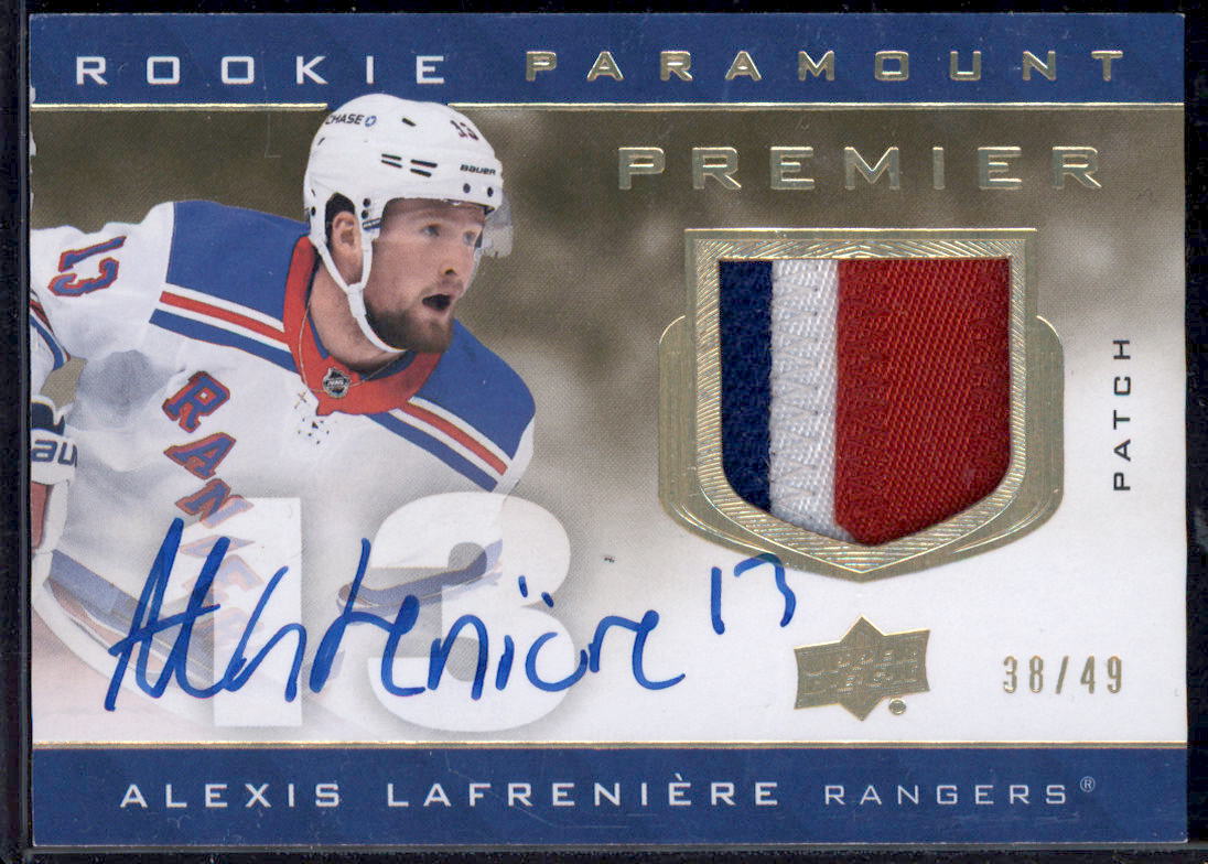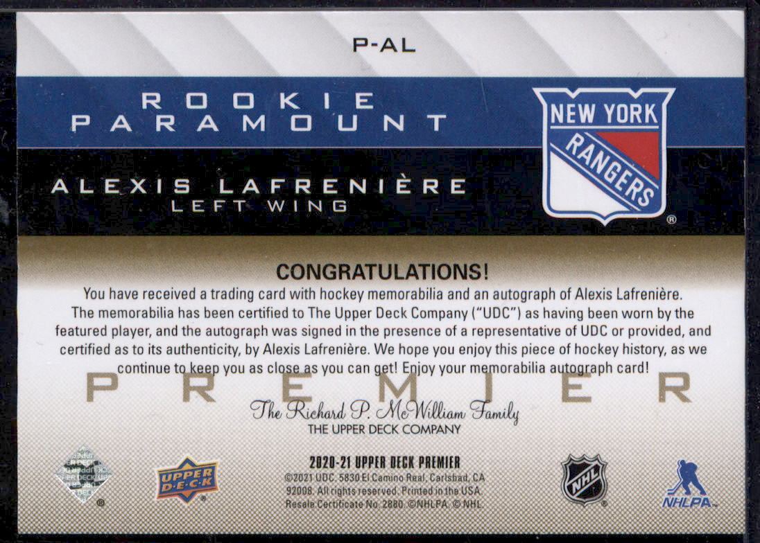 2020-21 Upper Deck Premier Rookie Paramount Patch Alexis Lafreniere RC Auto /49