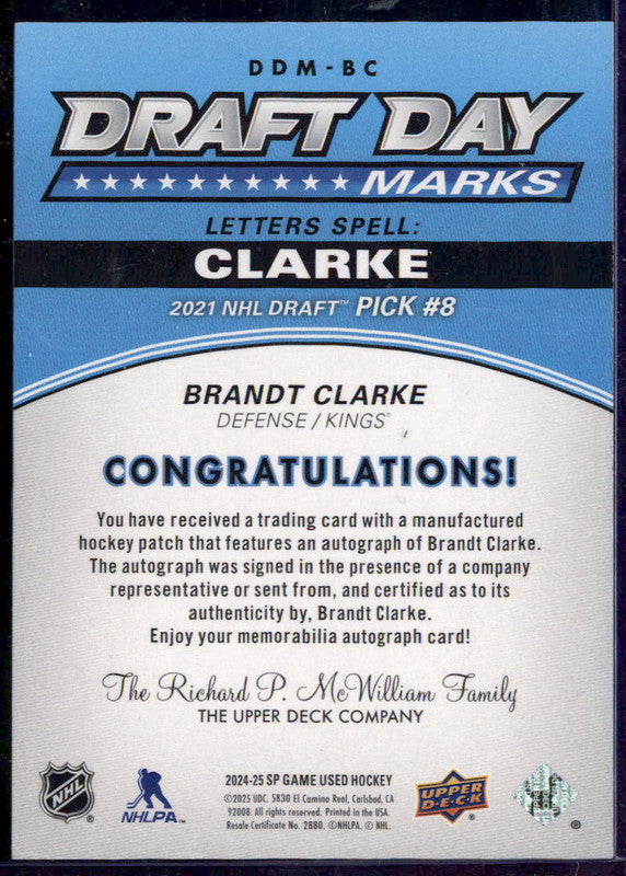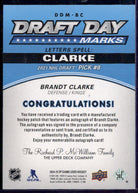 2024 UD SP Game Used Draft Day Marks Rookies #DDM-BC Brandt Clarke RC Auto /35