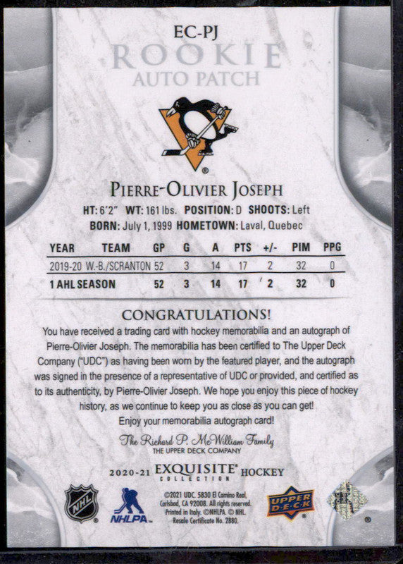 2020-21 The Cup Exquisite Rookie Auto Patch #EC-PJ Pierre-Olivier Joseph RC /73
