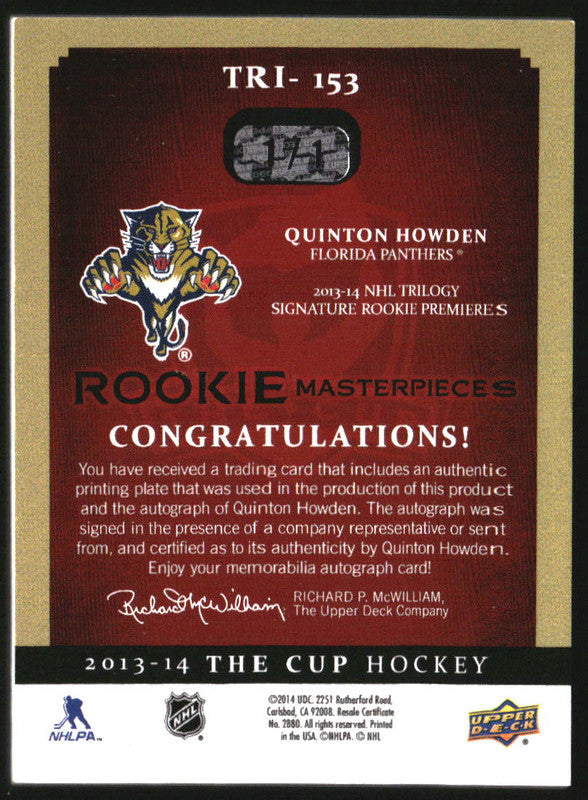 2013-14 The Cup Printing Plate Black Rookie Autograph Quinton Howden RC Auto 1/1