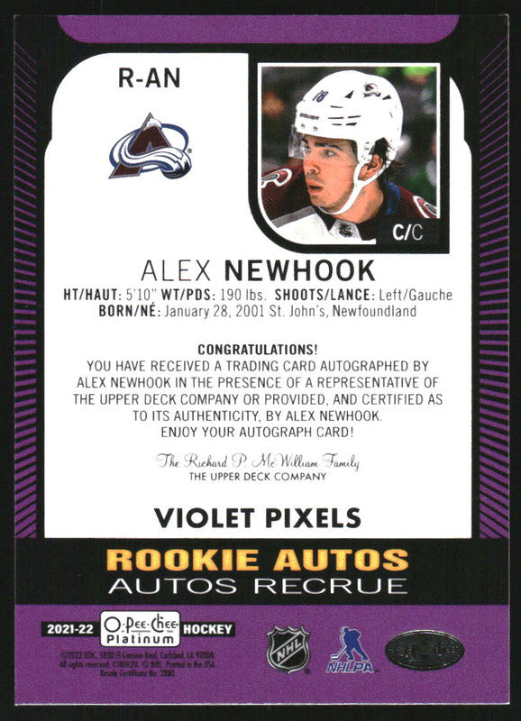 2021 O-Pee-Chee Platinum Rookie Autographs Violet Pixels Alex Newhook RC Auto