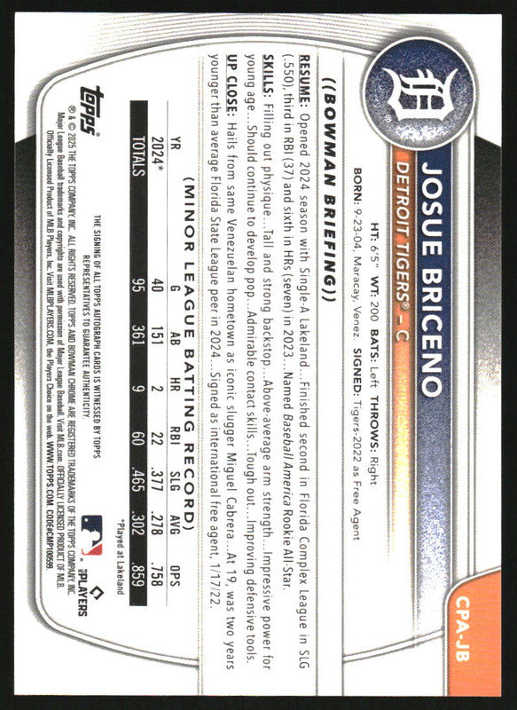 2025 Bowman Chrome Autographs #CPA-JB Josue Briceno RC Auto