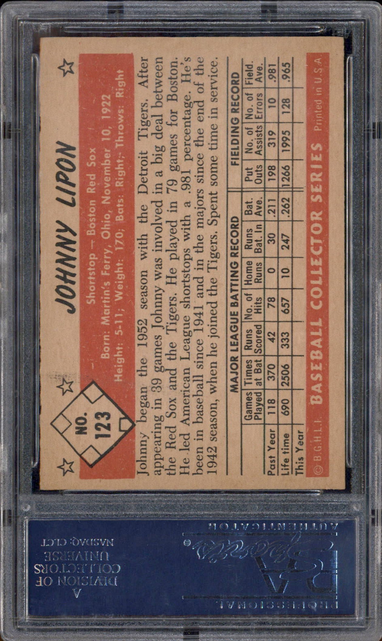 1953 Bowman Color #123 Johnny Lipon PSA 7
