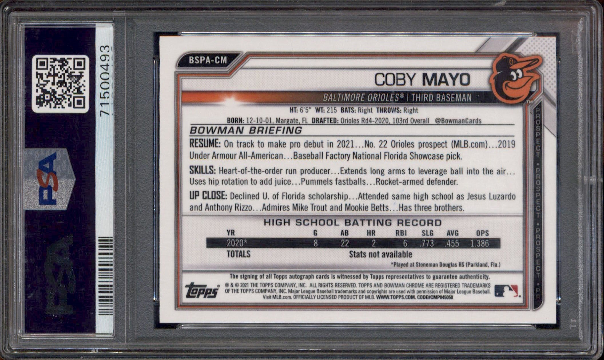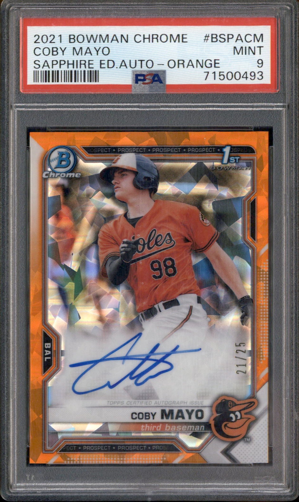 2021 Bowman Sapphire Autographs Orange Refractor Coby Mayo Auto /25 PSA 9