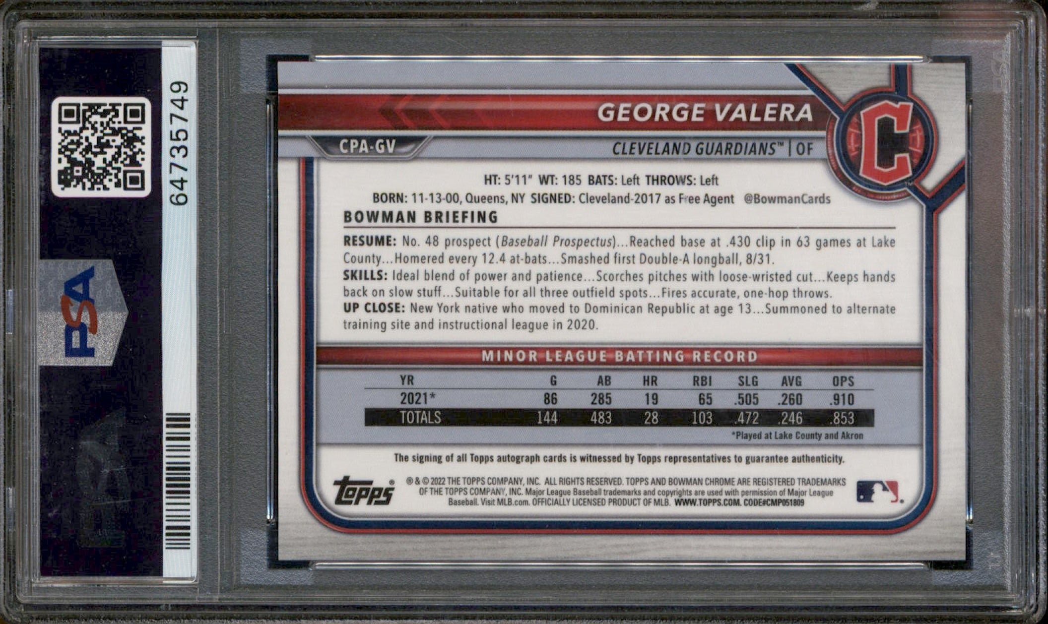 2022 Bowman Chrome Orange Refractor #CPA-GV George Valera Auto /25 PSA 10