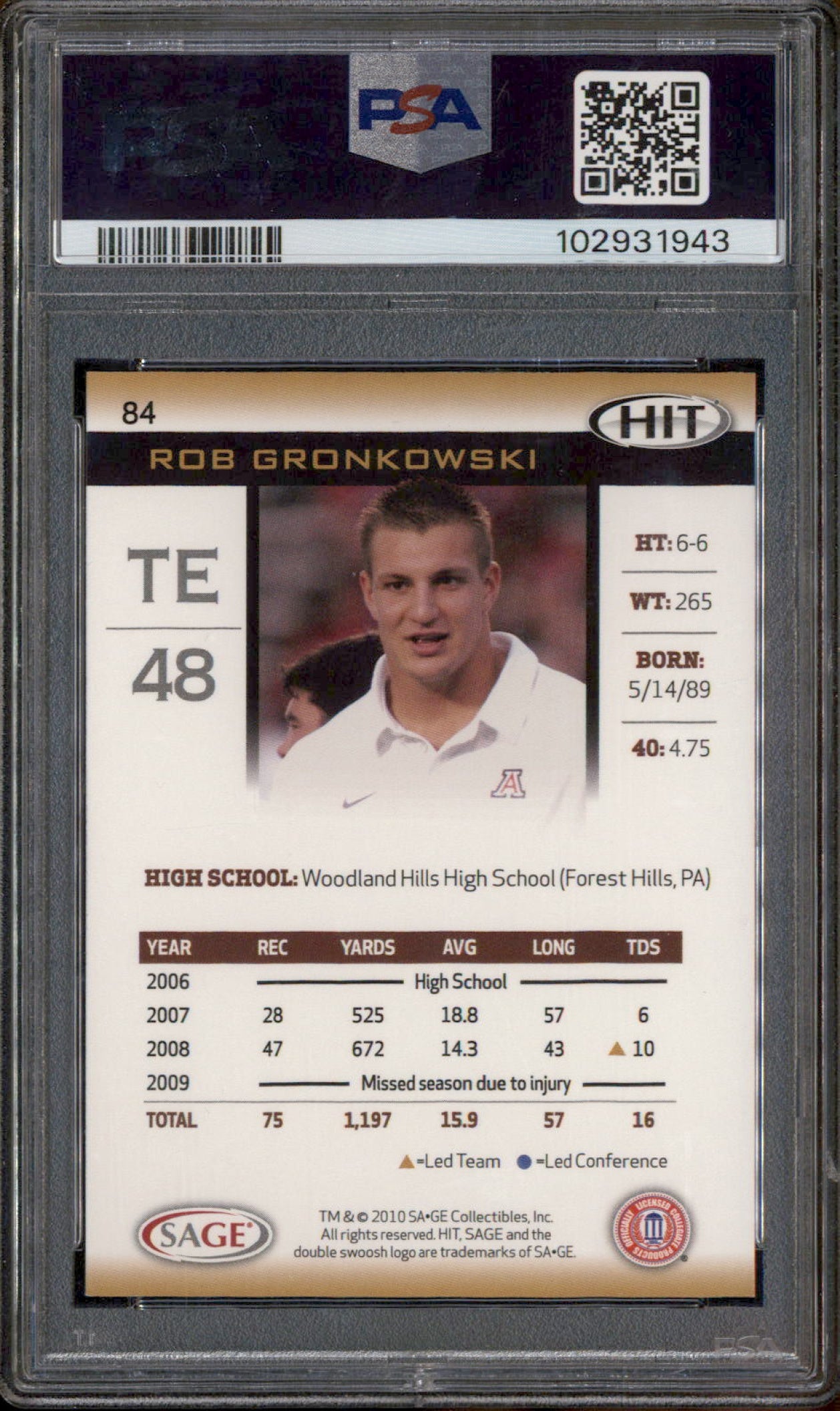 2010 SAGE HIT #84 Rob Gronkowski RC PSA 9