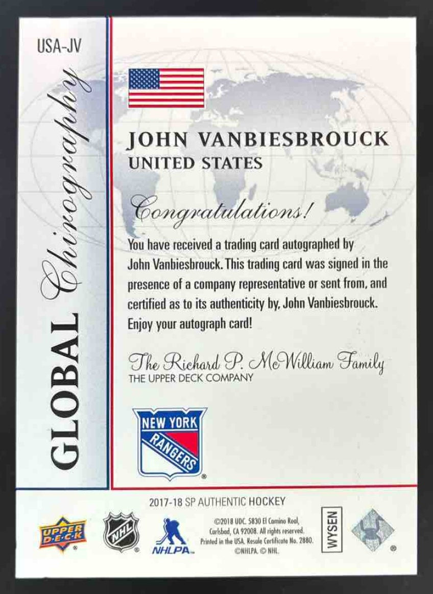 2017-18 SP Authentic Global Chirography #USA-JV John Vanbiesbrouck