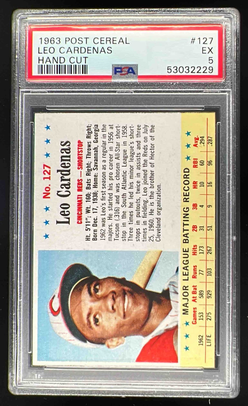 1963 Post Cereal Hand Cut #127 Leo Cardenas PSA 5