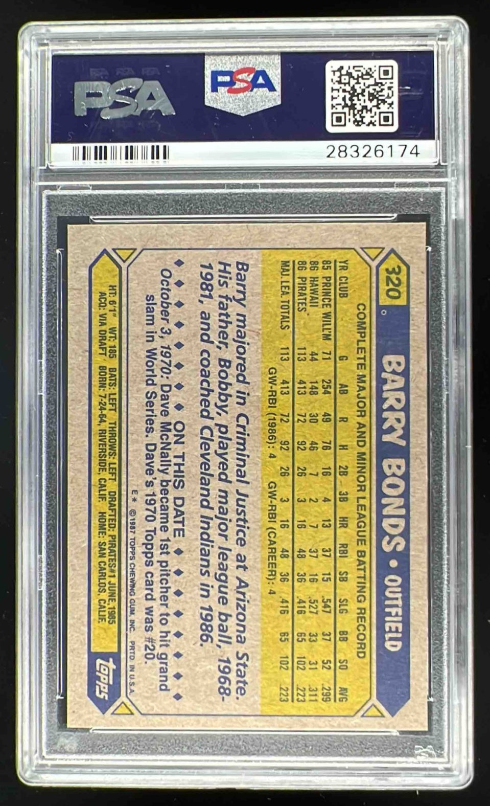 1987 Topps #320 Barry Bonds RC PSA 6