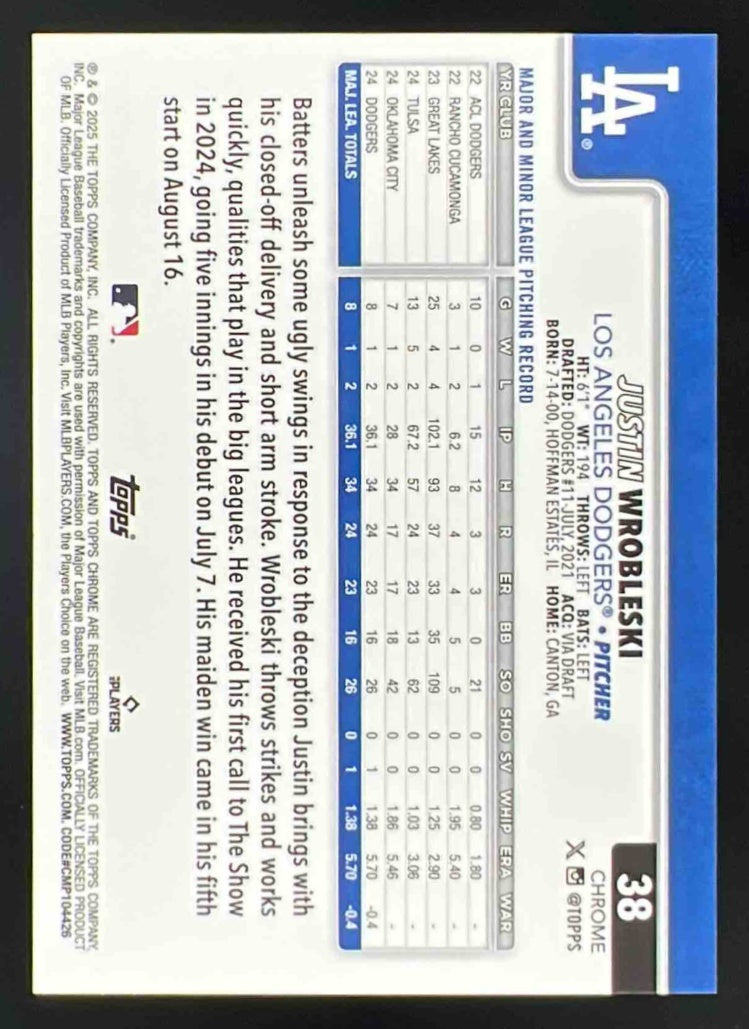 2025 Topps Chrome Sapphire Orange Sapphire #38 Justin Wrobleski RC /25