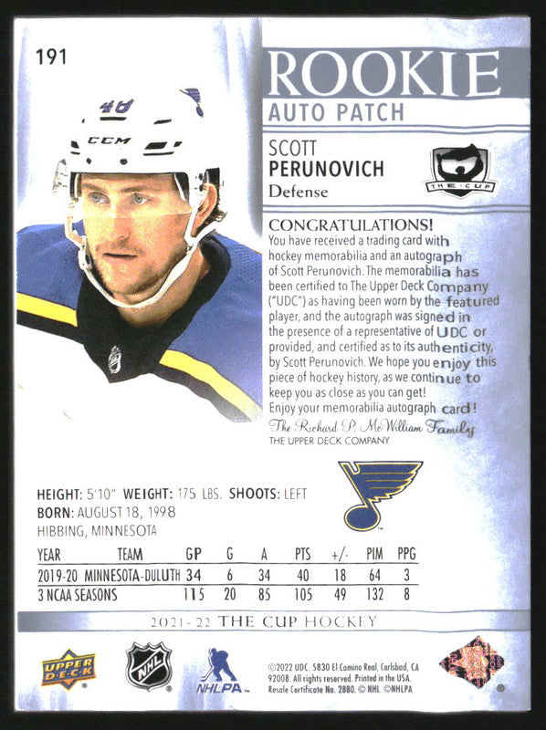 2021-22 The Cup #191 Scott Perunovich RC Jersey Auto /249