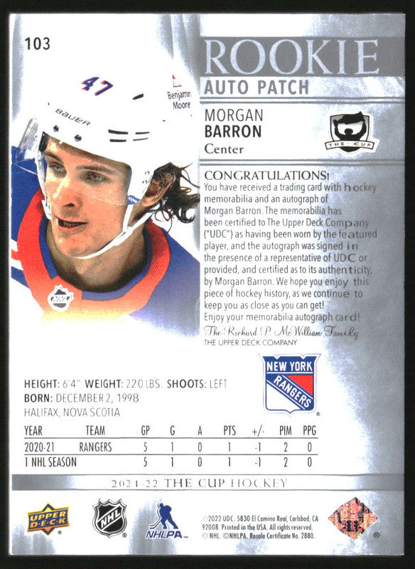 2021-22 The Cup #103 Morgan Barron RC Jersey Auto /249