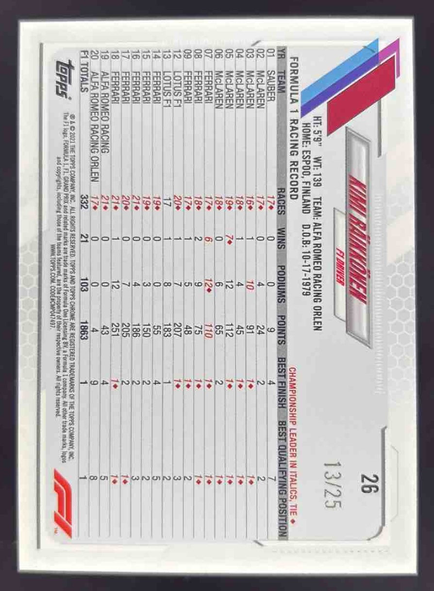 2021 Topps Chrome Formula 1 Orange Checker Flag Refractor #26 Kimi Raikkonen /25