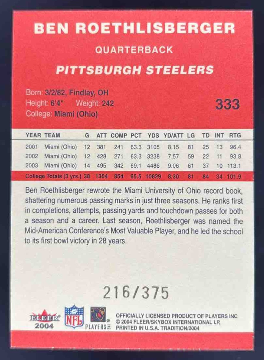 2004 Fleer Tradition Draft Day #333 Ben Roethlisberger RC /375