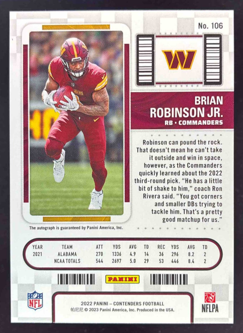 2022 Contenders Rookie Ticket Wild Card Round #106 Brian Robinson Jr. RC Auto