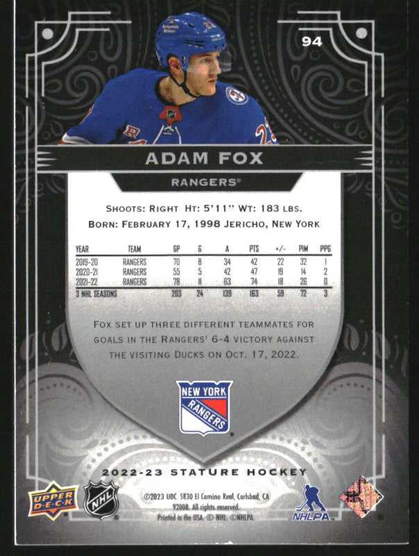 2022-23 Upper Deck Stature Black #94 Adam Fox /15