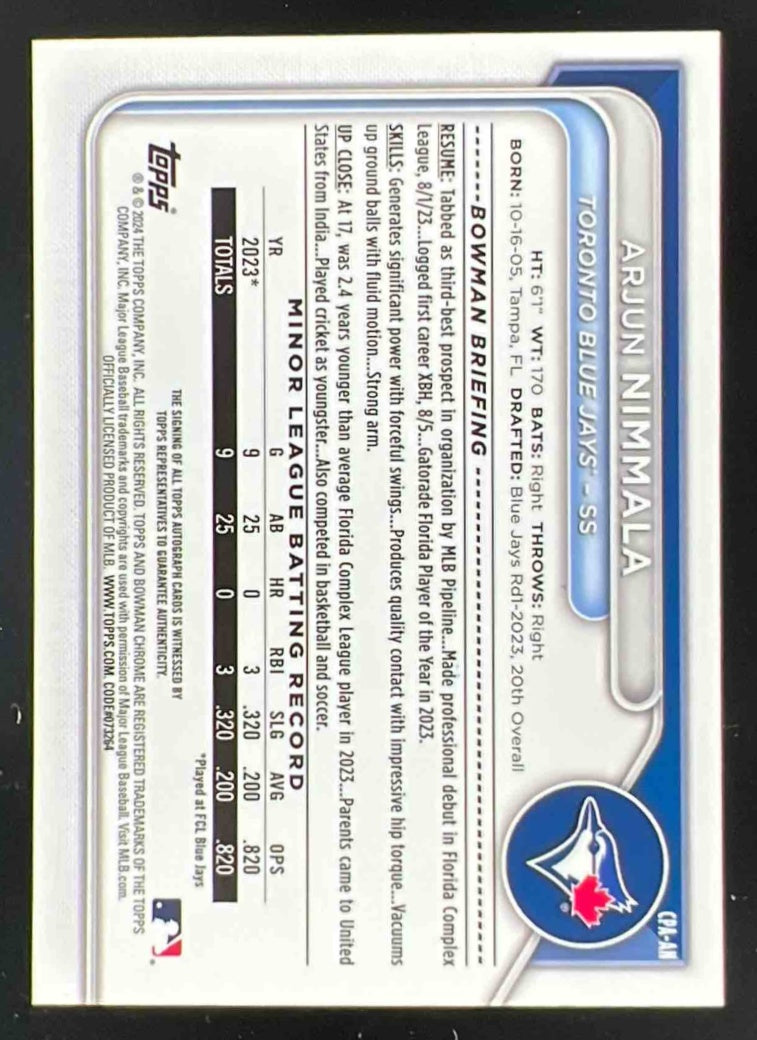 2024 Bowman Chrome Autographs #CPA-AN Arjun Nimmala RC Auto