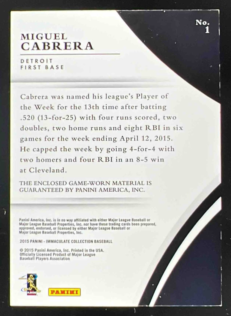 2015 Immaculate Collection Immaculate Swatches Prime #1 Miguel Cabrera /5
