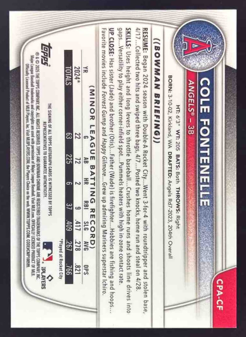 2025 Bowman Chrome Reptilian Orange Refractor #CPACF Cole Fontenelle RC Auto /25