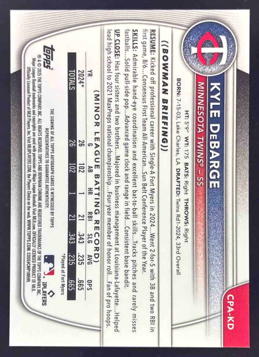 2025 Bowman Chrome Autographs Green Refractor #CPA-KD Kyle DeBarge RC Auto /99