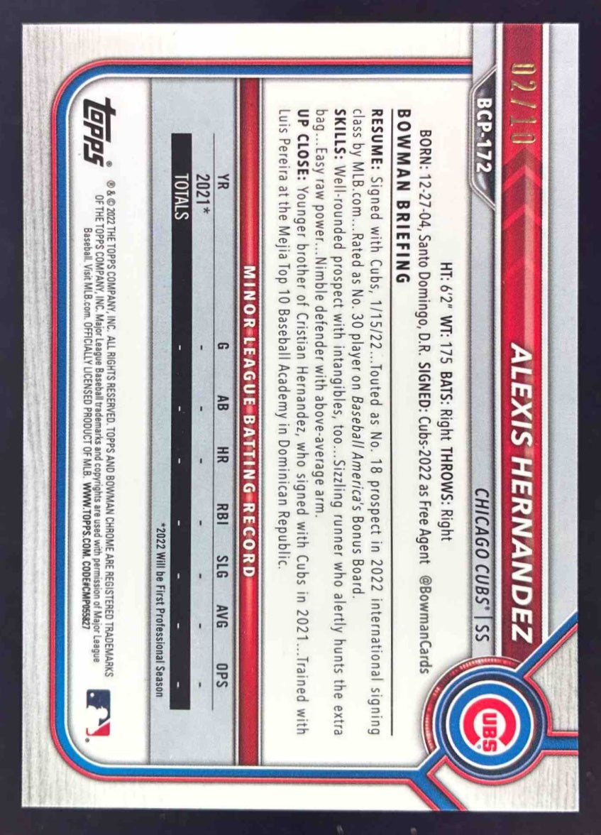 2022 Bowman Chrome Prospects Red Shimmer Refractor Alexis Hernandez RC /10