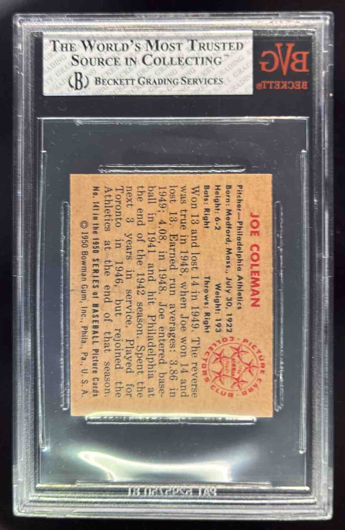 1950 Bowman #141 Joe Coleman RC BGS 7