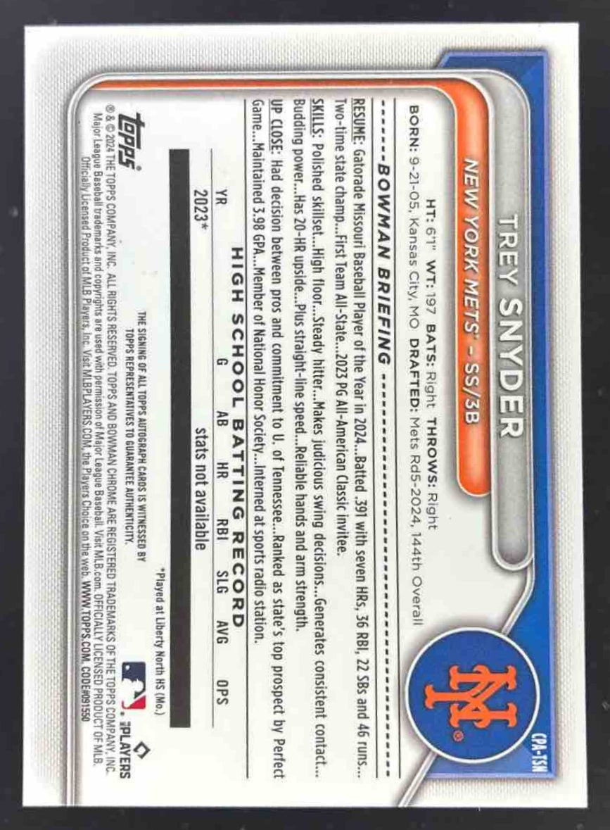 2024 Bowman Chrome Autographs Black Refractor #CPA-TSN Trey Snyder RC Auto /10