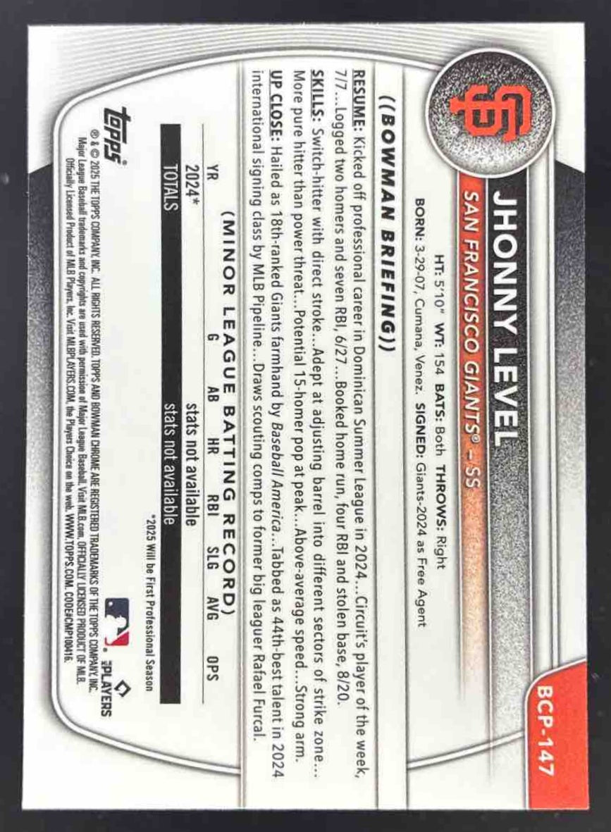 2025 Bowman Chrome Prospects Yellow X-Fractor #BCP-147 Jhonny Level RC /75