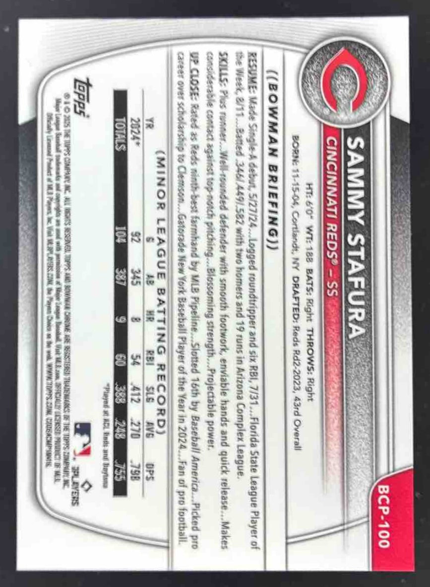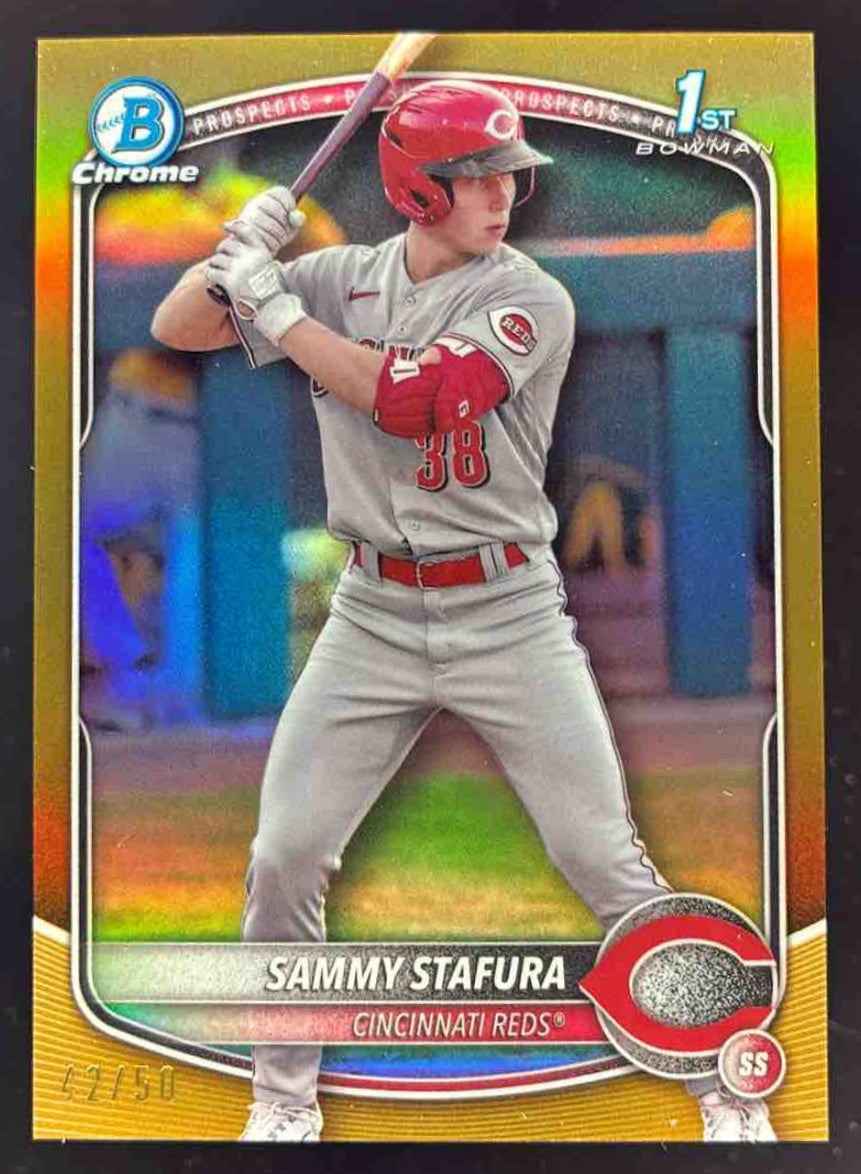 2025 Bowman Chrome Prospects Gold Refractor #BCP-100 Sammy Stafura RC /50