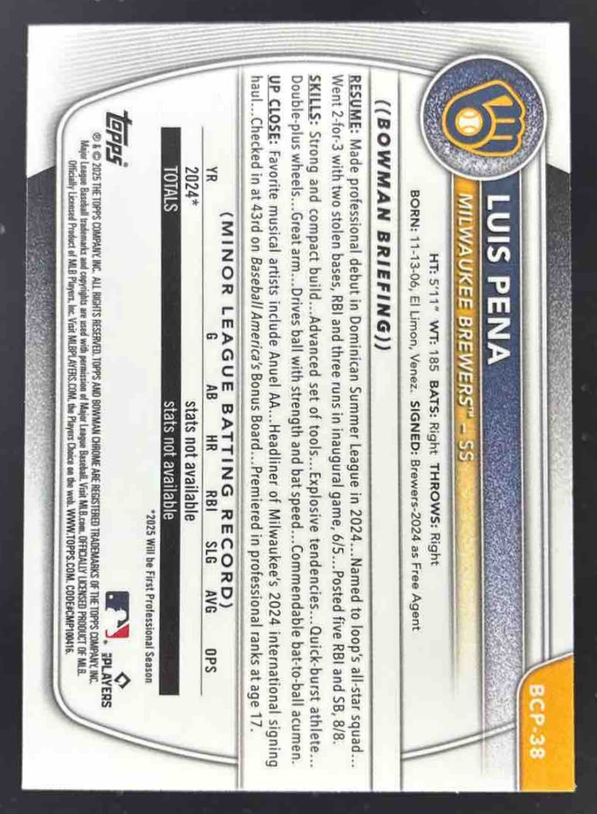 2025 Bowman Chrome Prospects Blue Refractor #BCP-38 Luis Pena RC /150
