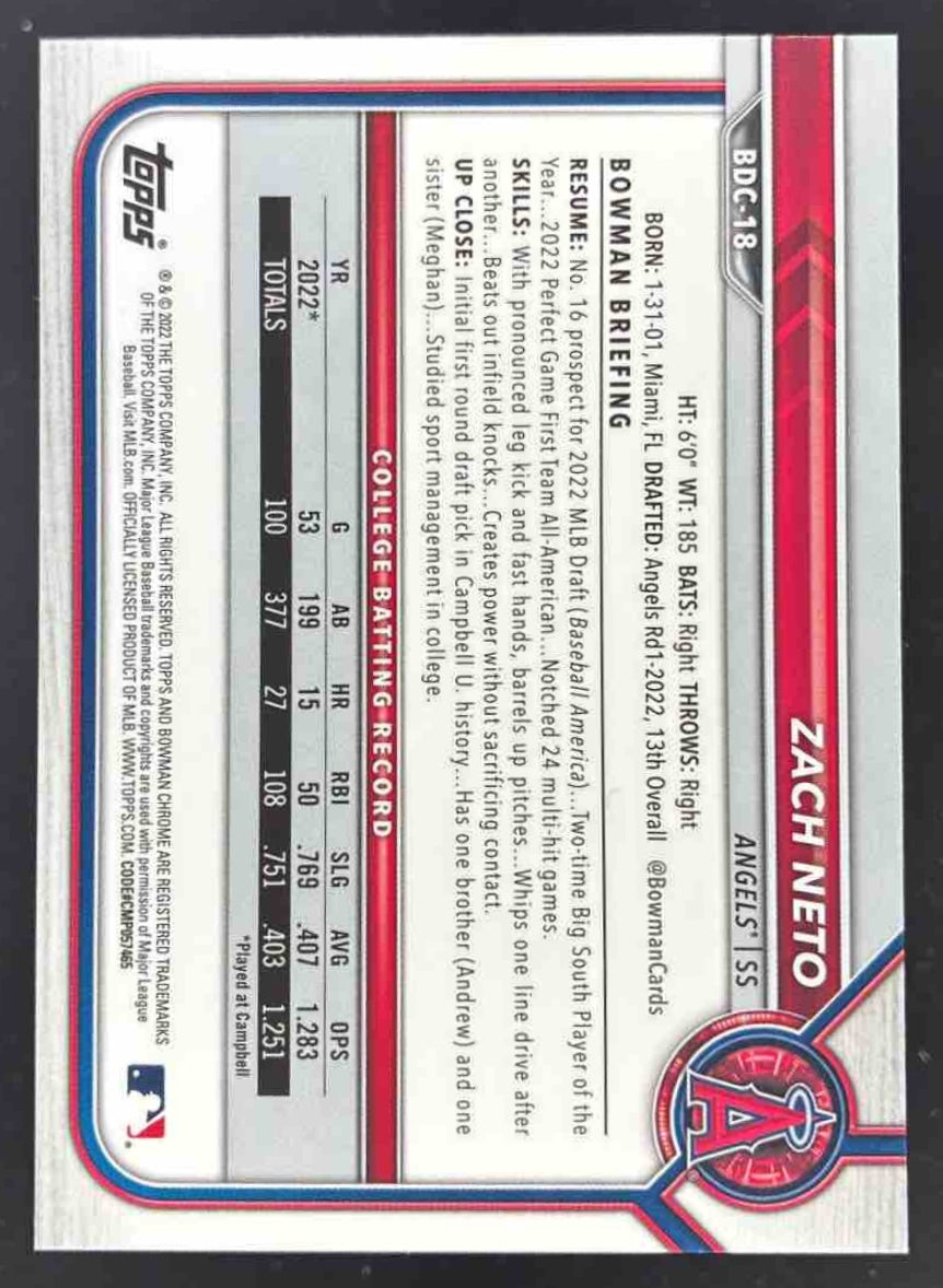 2022 Bowman Draft Sapphire Chrome Yellow #BDC-18 Zach Neto RC /99