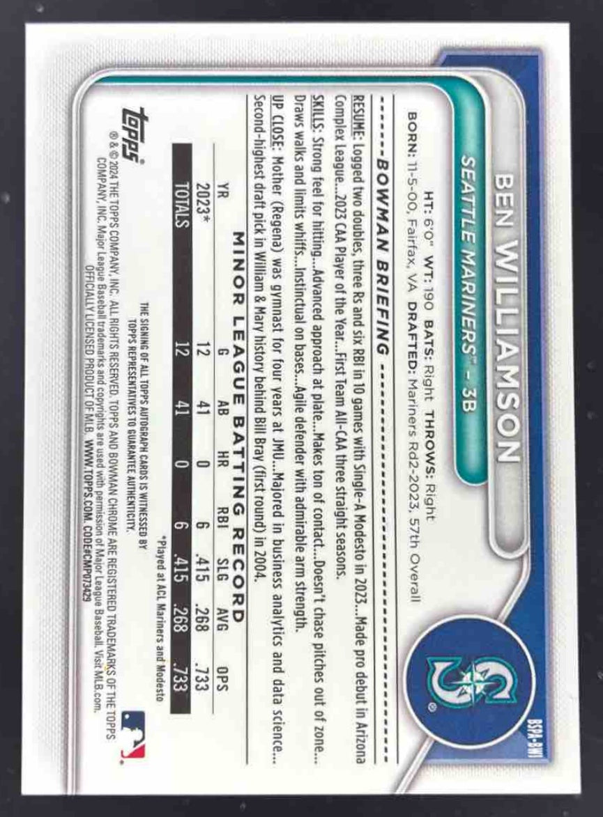 2024 Bowman Sapphire Chrome Autograph Green #BSPA-BWI Ben Williamson RC Auto /99