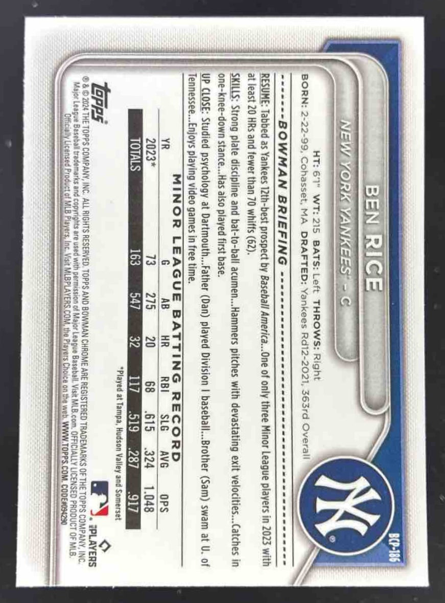 2024 Bowman Chrome Prospects Mega Box Blue Mojo #BCP-186 Ben Rice RC /150