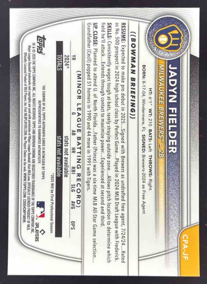 2025 Bowman Chrome Autographs Gold Refractor #CPA-JF Jadyn Fielder RC Auto /50