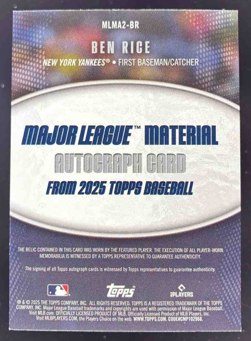 2025 Topps Major League Material Autographs #MLMA2-BR Ben Rice RC Auto /50