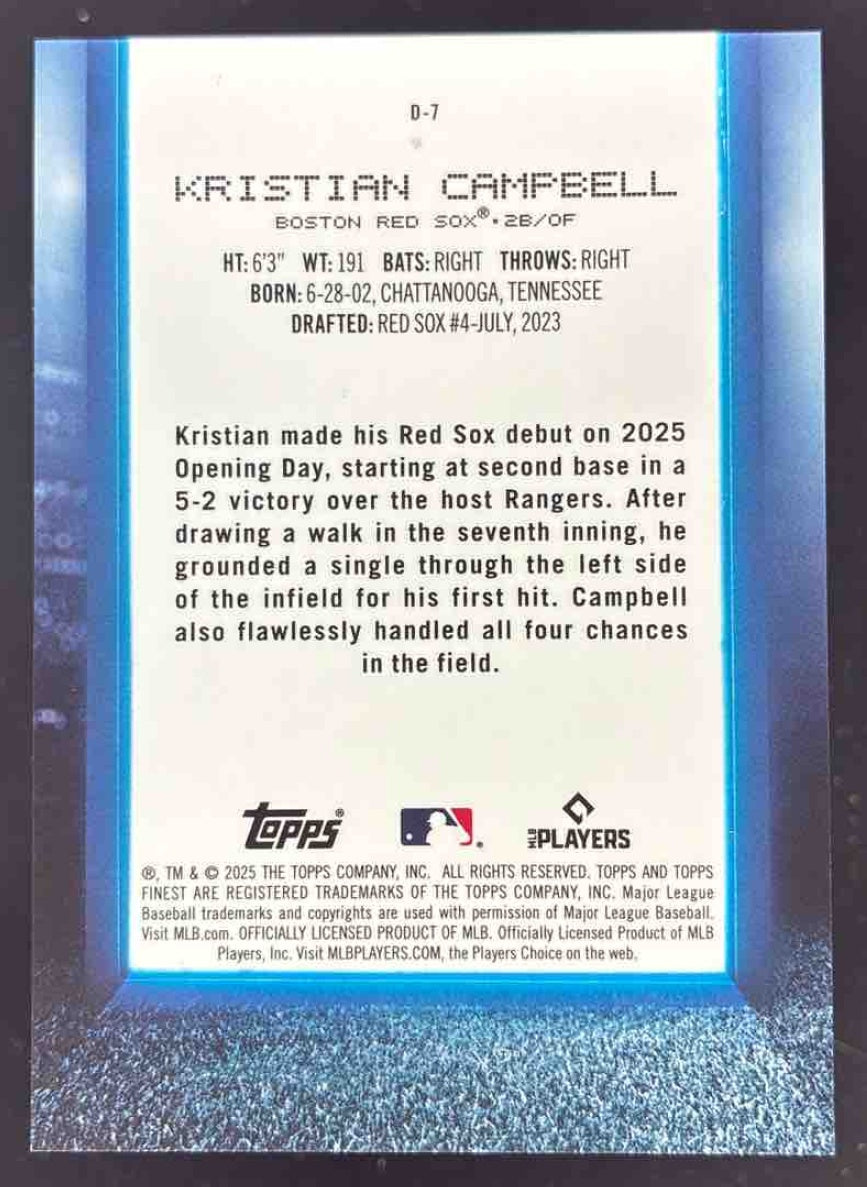 2025 Topps Finest Debut Orange Refractor #D-7 Kristian Campbell RC /25
