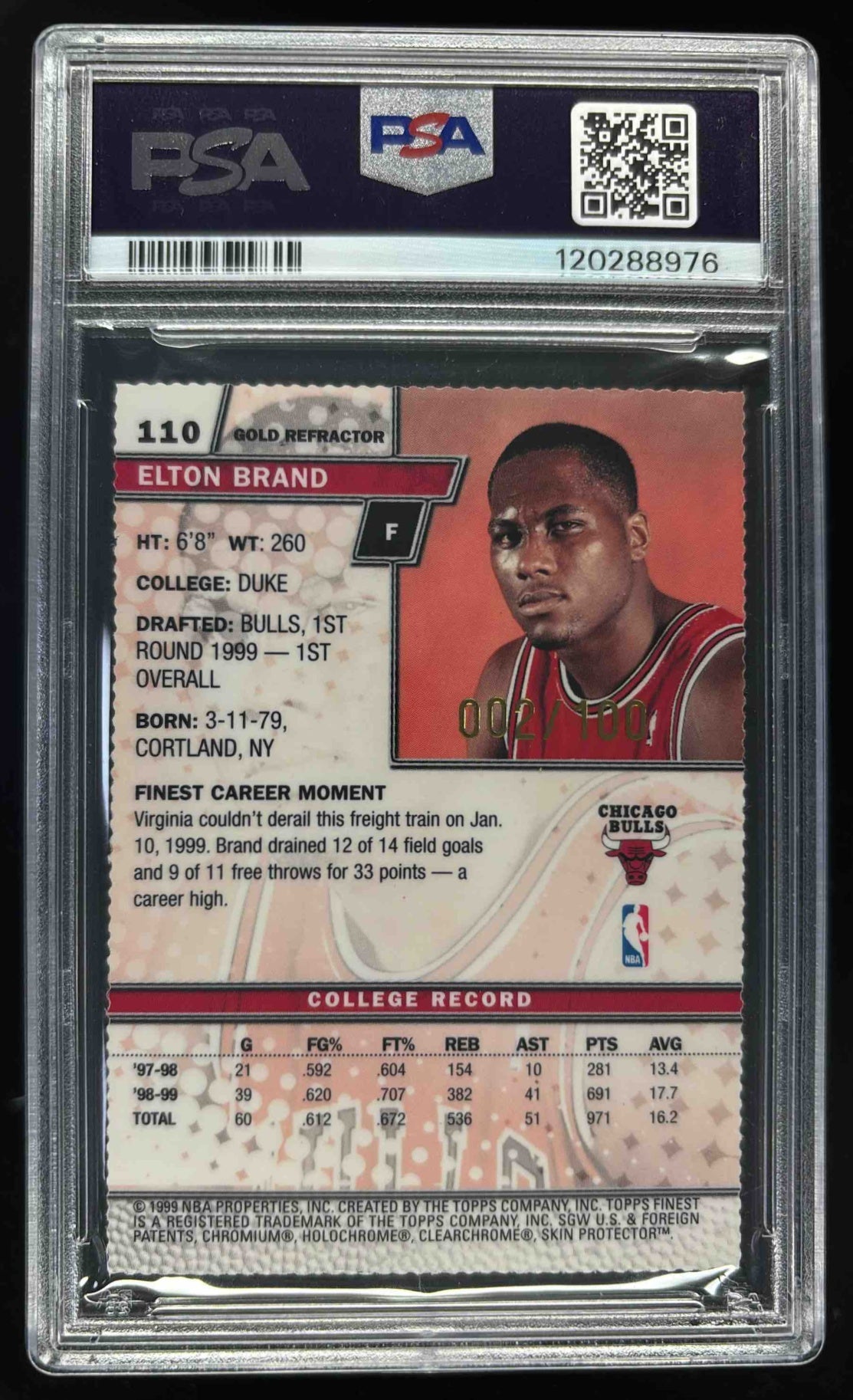1999-00 Topps Finest Gold Refractors #110 Elton Brand RC /100 PSA 8