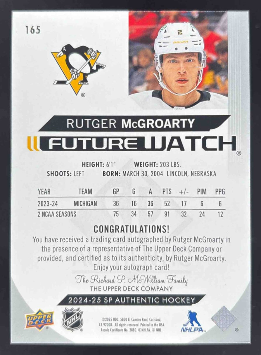 2024-25 Upper Deck SP Authentic #165 Rutger McGroarty RC Future Watch Auto /999