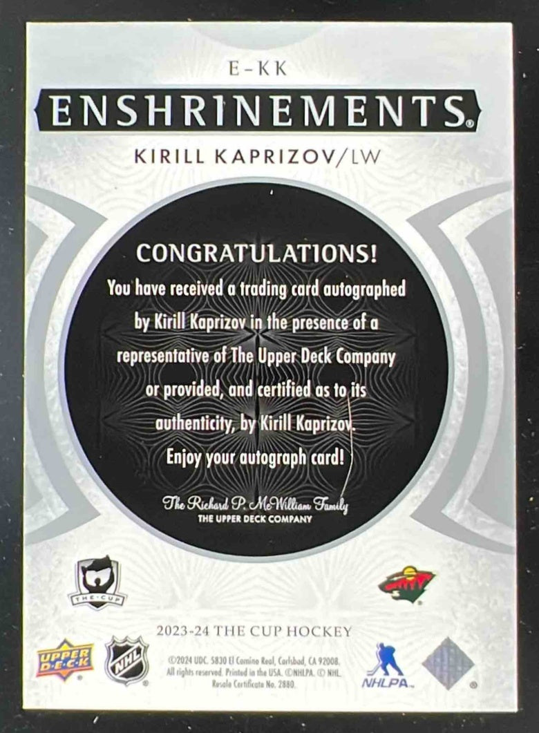 2023-24 The Cup Enshrinements #E-KK Kirill Kaprizov Autograph Auto /25