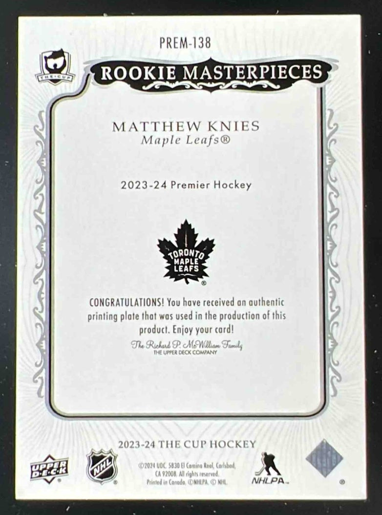 2023-24 The Cup Rookie Masterpiece Plates Premier Magenta Matthew Knies 1/1