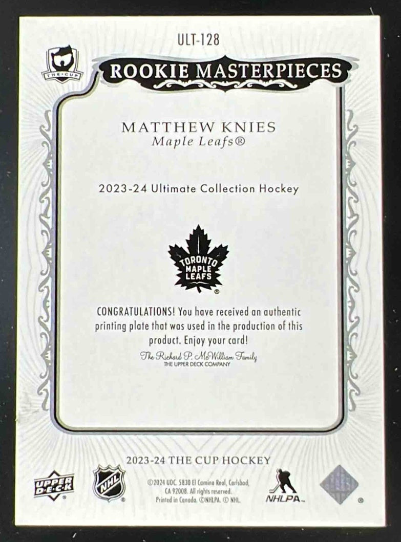 2023-24 The Cup Rookie Masterpiece Printing Plates Black Matthew Knies 1/1