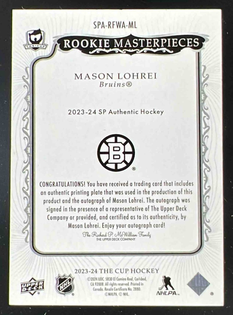 2023-24 The Cup Printing Plate Yellow Autograph Mason Lohrei RC Auto 1/1