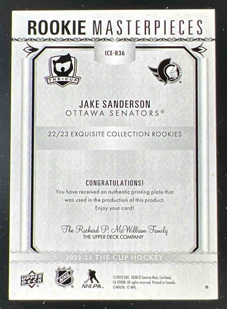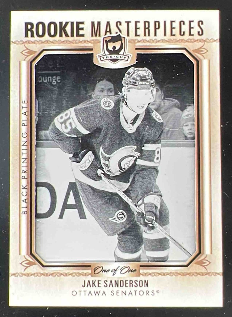 2022-23 The Cup Rookie Masterpieces Printing Plate Black Jake Sanderson 1/1