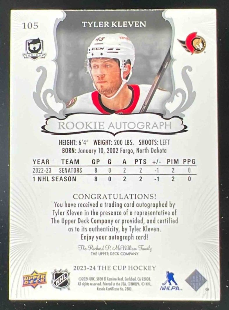 2023-24 The Cup Gold Spectrum Foil #105 Tyler Kleven Autograph RC Auto /36