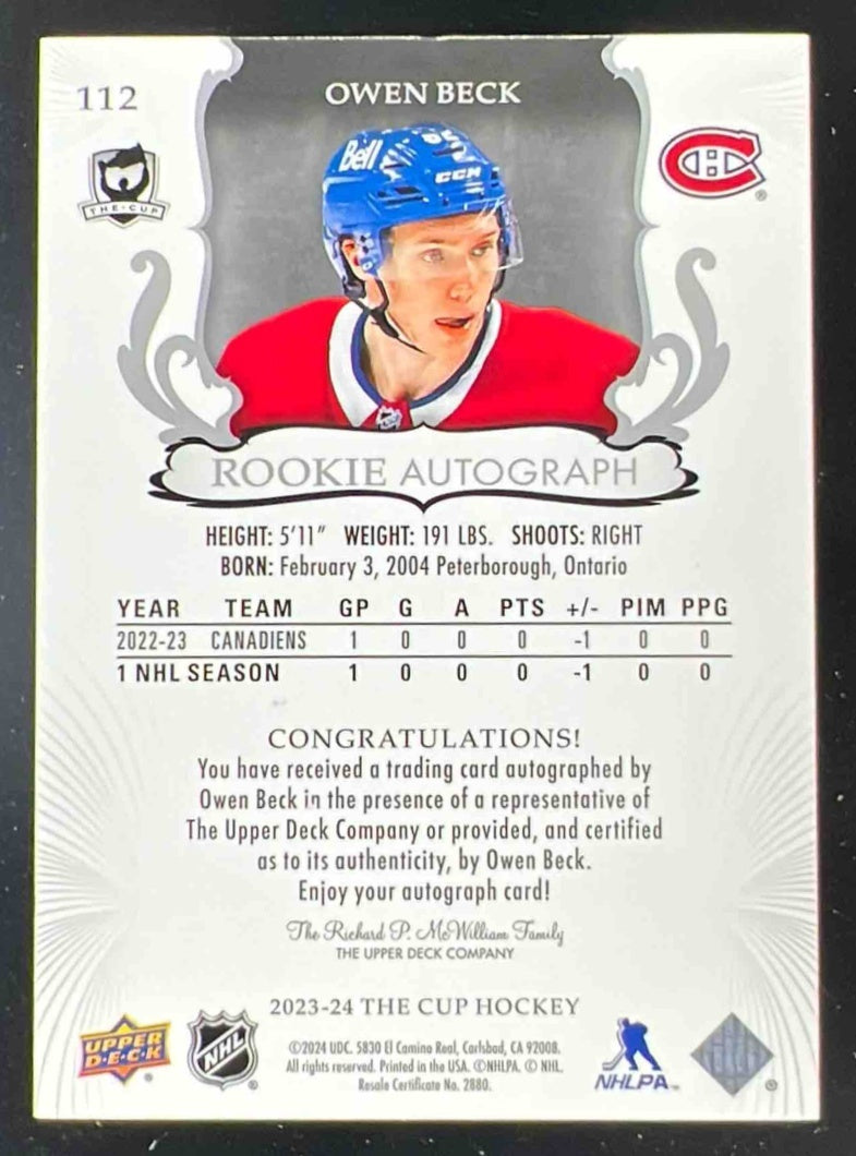 2023-24 The Cup Gold Spectrum Foil #112 Owen Beck Autograph RC Auto /36