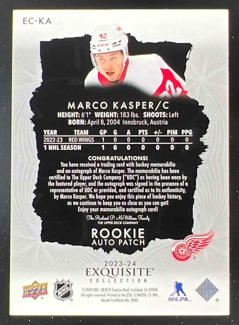2023-24 The Cup Rookie Auto Patch #EC-KA Marco Kasper Autograph Auto /92