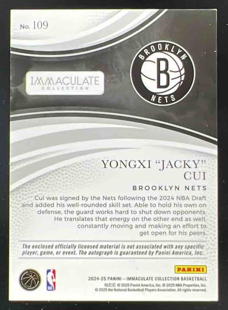 2024-25 Immaculate Collection Rookie Patch #109 Yongxi "Jacky" Cui RC Auto /99