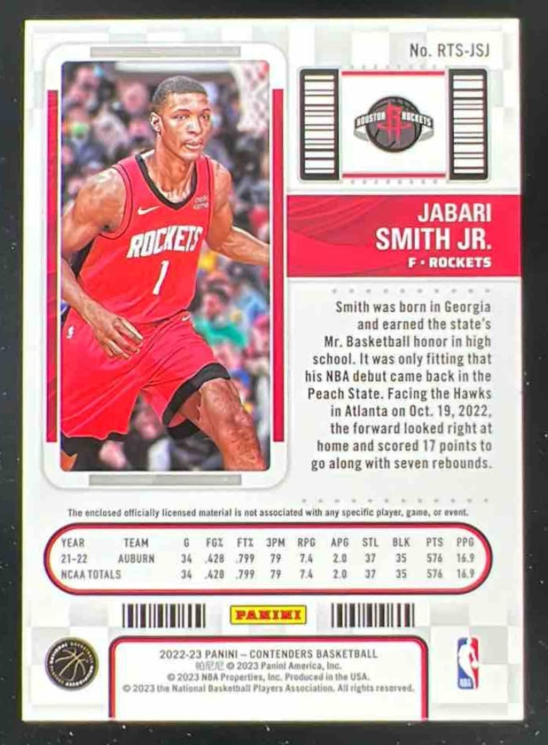 2022-23 Contenders Rookie Ticket Swatches Prime #RTS-JSJ Jabari Smith Jr. RC /10