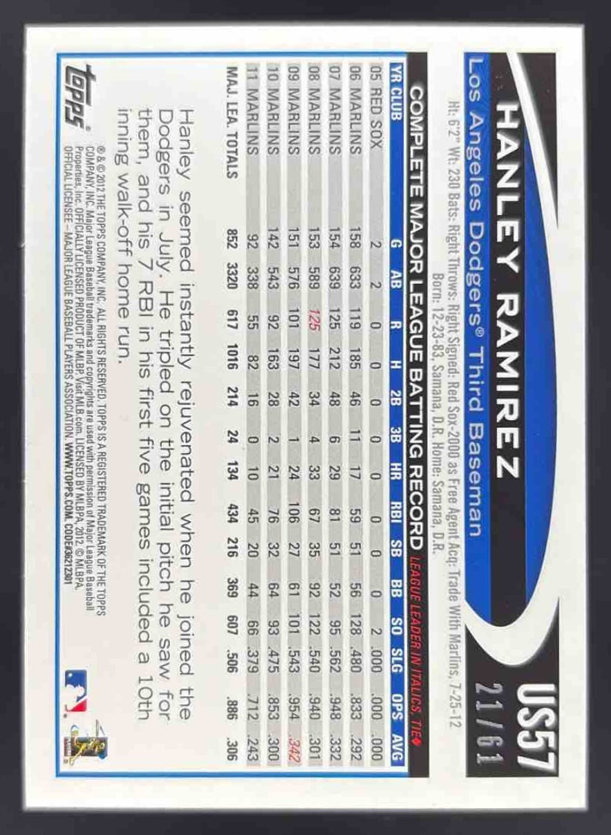 2012 Topps Update Black #US57 Hanley Ramirez /61