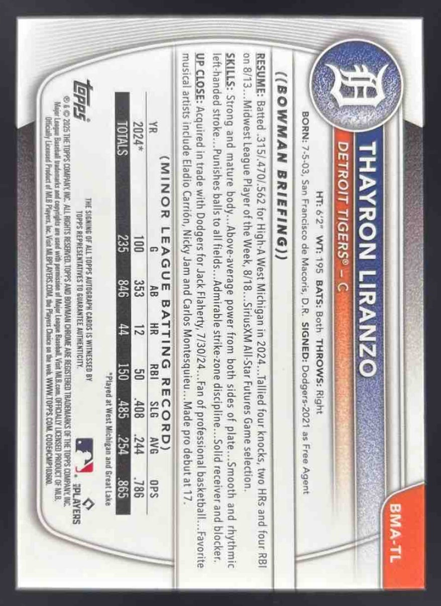 2025 Bowman Chrome Mega Box Blue Refractors #BMA-TL Thayron Liranzo Auto /150
